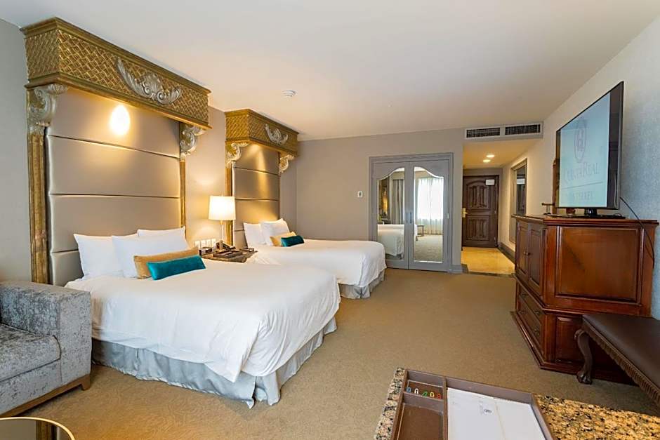 Gran Clase Executive Tower Two Beds is 603 square feet and includes 2 queen-size beds 150-154 width plus slippers.